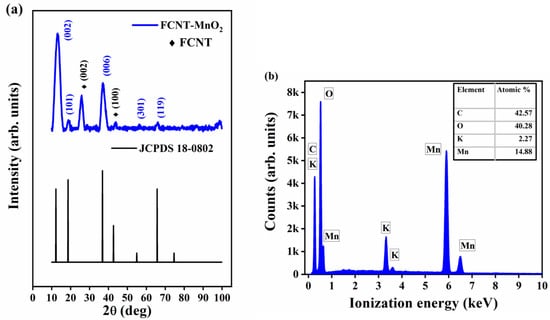 (a) XRD pattern of FCNT-MnO2 and (b) energy dispersive x-ray (EDS) spectrum of FCNT-MnO2.