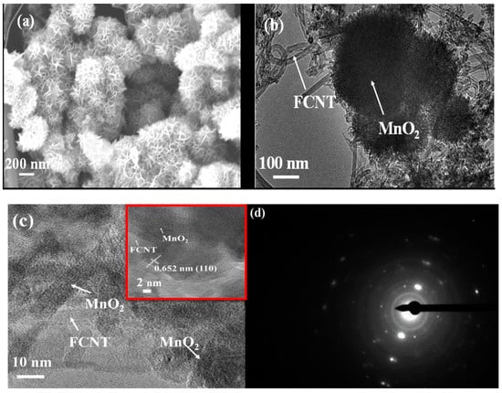 The TEM analysis of FCNT-MnO2 is presented in Figure 2b,c. The diameter of the FCNT was calculated using ImageJ analysis of TEM micrographs and was found to be varying between 15 nm and 25 nm with majority of nanotubes having a diameter of 20 nm. It could also be seen from Figure 2b that certain MnO2 nanoflowers grew on the surface of FCNT. The MnO2 nanoflowers were observed as dark flowers on the surface of entangled carbon nanotubes. The high resolution TEM image is shown in Figure 2c, which indicates that FCNT and MnO2 lattice fringes overlapping onto each other. This proves that the MnO2 grew on the surface of FCNT. The numbers of walls of FCNT were found to be 12 to 15 with lattice spacing of 0.34 nm. The lattice spacing of MnO2 was found to be 0.652 nm for (110) plane as shown in the inset of Figure 2c which is close to the d-spacing calculated from the X-ray diffraction pattern of FCNT-MnO2. The SAED pattern shown in the Figure 2d indicates a series of rings with bright spots indicating that the hybrid material consisted of well crystalline MnO2 with tetragonal crystal structure. As shown in the SAED pattern, the rings correspond to the (301), (400), and (220) planes of tetragonal MnO2 and matching well with that of XRD pattern of MnO2 (Figure S2b).
