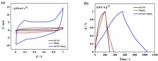 The electrochemical analysis was done in a two-electrode system using BioLogic systems. The electrochemical cell was fabricated using a Swagelok cell. Three main techniques were utilized for the electrochemical analysis: cyclic voltammetry (CV), galvanostatic charge discharge (GCD), and potentiometric electrochemical impedance spectroscopy (PEIS or EIS). A comparative electrochemical performance of FCNT, MnO2, and FCNT-MnO2 is shown in Figure 3.