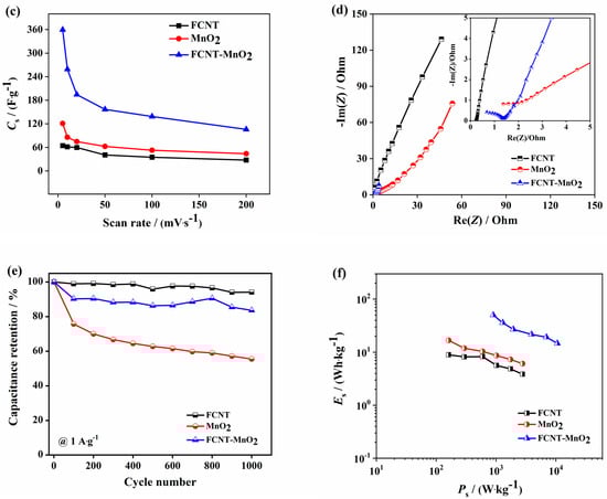 In Figure 3a, while FCNT has the least loop area under the curve, FCNT-MnO2 has the highest area for the same scan rate. It is also evident that FCNT has EDLC nature with almost rectangular-like structure, while MnO2 and FCNT-MnO2 have slightly redox-type curves, representing the pseudo-nature of the materials. The redox peaks are seen at 0.35 V, and 0.22 V for MnO2, and these are shifted to 0.19 V, and 0.36 V/0.55 V for FCNT-MnO2 in the forward and reverse cycles of cyclic voltammetry curve. The presence of peaks indicates the pseudo-nature of the material. The presence of two peaks in the reverse cycle signifies that the ‘Mn’ undergoes multiple valency changes during the electrochemical mechanism [,]. This redox mechanism helps in the longer interaction of the electrolyte with the material, thus resulting in high specific capacitance. From the GCD analysis in Figure 3b, the charge-discharge profile appears quite-linear and symmetric with higher charge-discharge time for the hybrid compared to that of the other two owing to its improved charge storage capacity over the individual materials. The plot of specific capacitance vs. scan rate shown in Figure 3c indicates highest values for FCNT-MnO2 hybrid among the three and gradually reduces for MnO2 and FCNT respectively. The high specific capacitance in hybrid could be due to the fact that MnO2 nanoflowers acting as electrolyte reservoir utilizing high effective surface area of the hybrid during the electrochemical mechanism []. The specific capacitance for FCNT-MnO2 is observed to decrease from 359.54 F g−1 at 5 mV s−1 to 105.77 F g−1 at 200 mV s−1 while for MnO2 the value is decreased from 120.94 to 43.76 F g−1, and in the case of FCNT, it has values of 64.37 and 27.69 F g−1 at the aforementioned scan rates, respectively. The EIS analysis in Figure 3d shows the Nyquist plot, in which, the absence of semicircle in the case of FCNT could be due to its non-faradaic reactions and excellent chemical stability of FCNT [,]. The nearly straight slope in the low frequency region of Nyquist plot of FCNT-MnO2 indicated that the reactions were limited by diffusion resistance (Warburg impedance) rather than charge transfer resistance [,]. Also, the straight slope parallel to the imaginary axis indicates perfectly capacitive in nature. The equivalent series resistance (ESR) was found to be 1.37 Ω, and 0.682 Ω for MnO2 and FCNT-MnO2, respectively. This confirmed that the hybrid material had lesser ESR value than that of MnO2 alone proving that the inclusion of carbon nanotube as a conducting path in hybrid nanostructure had an improvement in the overall conductivity. Further, the semicircle developed in the high frequency region of the Nyquist plot (inset of Figure 3d) correspond to the charge transfer resistance (CTR) developed []. The value of CTR (calculated using the radius of the semicircle) was found to be 0.82 Ω for FCNT-MnO2, however, for MnO2 there is no visible semicircle; instead, it shows a flat line nature (inset of Figure 3d) which can be attributed to a large value of ESR existing at higher frequencies. Hence, the addition of FCNT to MnO2 had greatly reduced both ESR and CTR of the hybrid nanostructure. The Bode plot obtained from EIS analysis (Supplementary Section—S4.5, S4.6, and S4.7) shows that at the lowest frequency of 0.1 Hz, the negative phase angle was found to be 71.34°, 54.82°, and 66.6° for FCNT, MnO2 and FCNT-MnO2 respectively. It was observed that FCNT and FCNT-MnO2 had phase angles close to capacitor (−90°), and hence FCNT-MnO2 can be considered as a good supercapacitor electrode material. It was observed that in the case of MnO2, the negative phase angle had drastically increased to 54.82° from 73.97° (Figure S6) indicates that it had very poor conductivity and developed resistance after 1000 cycles. The cyclic performance shown in Figure 3e was evaluated for 1000 cycles for each one. Hybrid FCNT-MnO2 showed a higher capacitance retention of 83.59% compared to MnO2 with 55.52%. MnO2 exhibited poor capacitance retention due to its poor conductivity and development of high charge transfer resistance []. The capacitance retention is dependent on the overtime development of charge transfer resistance in the electrode material. Since FCNT is chemically stable compared to MnO2 and principally has EDLC nature, it does not develop any significant charge transfer resistance overtime as its electrochemical reactions are non-faradaic. As a result, the capacitance retention is maximum for FCNT whether in case of FCNT-MnO2 hybrid, there is evidence of a small charge transfer resistance development due to the presence of MnO2 which results in the loss of capacitance retention. The hybrid nanostructured FCNT-MnO2 excellent capacitance retention can be attributed to the addition of FCNT to MnO2 which improved the stability of MnO2 resulting in higher specific capacitance and specific energy. The ‘Ragone plot’ [], in Figure 3f, shows the high-performance nature of the hybrid material both in terms of specific energy and specific power. It can be seen that FCNT experienced a sudden drop in the specific energy at higher scan rates since FCNT has no greater charge storage capability. The highest value of specific energy was found for FCNT-MnO2 which is 49.93 Wh kg−1 at 5 mV s−1 followed by MnO2 and FCNT with 16.79 Wh kg−1 and 8.94 Wh kg−1 respectively. Thus, EIS and Ragone plot analyses further corroborate the idea of the improved performance of hybrid FCNT-MnO2 over its individual identities.