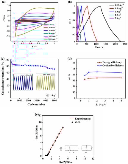 Figure 4a shows detail CV analysis of FCNT-MnO2 at different scan rates from 5 mV s−1 to 200 mV s−1. The CV analysis shows that as the scan rate increases, the area under the CV curve increases as shown in the Figure 4a. In the hybrid nanostructure, due to the contribution from both faradaic and non-faradaic reactions, the redox peaks were subdued when compared to MnO2 alone (Figure S6a). The non-faradaic reactions of FCNT might slightly subdue the pseudo nature of MnO2 in the hybrid nanostructure yet the influence of MnO2 is reflected in the pseudo-rectangular shape. The GCD analysis at various current densities from 0.25 A g−1 to 5 A g−1 of FCNT-MnO2 is shown in Figure 4b. The charge-discharge profiles appear linear and symmetric, which indicates that the hybrid electrode material is suitable for supercapacitor applications. During the electrochemical mechanism, the MnO2 nanoflowers participate in the reaction mechanism and store the electrolyte ions of the electrolyte in between the petals thus enhancing the effective surface area and acting as a reservoir for the electrolyte. The FCNT also stores some of the charge in its hollow tubular structure, thus contributing additional surface area. During electrochemical reactions, the hybrid indicates more charge storage ability without developing much charge transfer resistance as FCNT provide a faster electron transfer path and the charge storage mechanism is mostly done by MnO2 nanoflowers through their interaction with electrolyte. A specific capacitance value of 359.53 F g−1 was obtained at a scan rate of 5 mV s−1 which decreases to 105.77 F g−1 at 200 mV s−1 with an increasing scan rate as seen earlier. The decrease in the specific capacitance at high scan rates can be attributed to less surface area utilization of the material due to time limited interaction between electrode and electrolyte as the scan rate increases gradually. The equivalent series resistance (ESR) value obtained from the Nyquist plot of EIS analysis (Figure S7a) was 0.678 Ω and 0.682 Ω before and after 1000 cycles, respectively. The semicircle in the Nyquist plot indicates charge transfer resistance (CTR) and its value was found to be 0.685 Ω after 1000 cycles. The phase angle from the Bode plot (Figure S7b) was found to be 59.6° and 66.6° before and after 1000 cycles, respectively. The cyclic performance was evaluated at a current density of 1 A g−1 as shown in the Figure 4c and it was found that the cell retained 71.3% of the initial capacitance after 5000 cycles. From the first 10 cycles and the last 10 cycles of total 5000 cycles it is evident that the charge-discharge curves retained the linearity and symmetricity. This observation shows that the hybrid material had retained excellent capacitive features with high energy storage capability even after 5000 cycles. The performance of a material can be understood by evaluating its cyclic efficiency, energy efficiency (ηE), and coulombic efficiency (ηC). In case of hybrid supercapacitor due to non-linearity of cell potential, coulombic efficiency (ratio of discharge/charge durations) is overestimated, thus reporting only coulombic efficiency is misleading []. Herein, we have reported energy efficiency (the ratio of areas in discharge/charge curves) in parallel with Coulombic efficiency for a more realistic characterization. Finally, the percentage of energy recovered (energy efficiency) was calculated using the following equation
