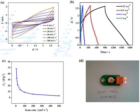 Figure 5a shows the CV analysis with different scan rates. Figure 5b shows the analysis obtained from GCD. The charge-discharge profiles were observed to be slightly asymmetric in nature. This could be attributed to the higher resistance offered form the organic electrolyte and the faradaic reactions lead to non-linear curves at lower current densities. As shown in the Figure 5c, the specific capacitance decreased from 47.62 F g−1 at 5 mV s−1 to 8.29 F g−1 at 200 mV s−1. During the electrochemical mechanism, TEABF4 in the electrolyte is split into TEA+ and BF4- at higher potentials. The positive ions get stored at the negative polarity of the electrode and vice versa. Finally, the cyclic performance of the electrochemical cell with organic electrolyte was tested for 1000 cycles and found that the cell retained above 70% of the initial capacitance after 1000 cycles (Figure S8). One lab-scale prototype CR2032 cell was made using FCNT-MnO2 hybrid electrode and organic electrolyte (1 M TEABF4 in acetonitrile) as shown in the Figure 5d. It was observed that charging the cell for 2 min resulted in a steady discharge of 4–5 min with almost uniform LED light intensity (visual observation). The detail performance optimization of FCNT-MnO2 hybrid electrode and organic electrolyte is going on and will be communicated in future communication.
