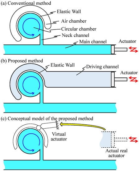 Figure 1b where the elastic wall is driven by the actuator attached at the end of the driving channel. When the vibrational pressure is put on the driving channel by the actuator, the volume of the circular chamber changes through the deformation of the wall, as if an actuator is surrounding the circular chamber and clamping it. Considering that the actual actuator does not exist near the chamber, even though it behaves as if it does, we call it a virtual actuator, as illustrated in