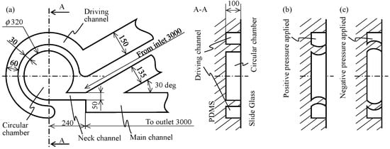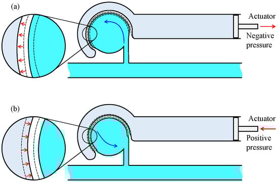 Figure 4b,c show the deformation of the elastic wall in the cross-sectional view between the circular chamber and the driving channel, where (b) and (c) show two cases of positive and negative pressures applied to the driving channel, respectively. The actual deformation is not very large, and