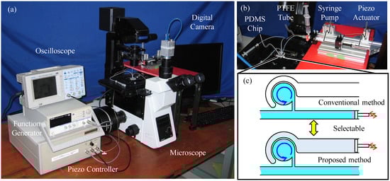 Figure 3 shows the experimental setup where (a), (b), and (c) are the overview of the system including the microscope, PDMS chip, and actuator, and the schematic of the PDMS chip. The PDMS chip is the microfluidic channel made by PDMS bonded on a slide glass. The development method and actual design of the PDMS chip are introduced in the next paragraph. A function generator (TEXIO, FG-274, Yokohama, Japan) generates a square wave and the piezo controller (MESS-TEK, M26109B) amplifies the square wave 15 times. It then sends the signal to the piezo actuator (MESS-TEK, PSt 150/5/40 VS10, Wako, Japan) to drive the vibrational motion to the channel surrounding the circular chamber. The oscilloscope is used for confirming the actually applied voltage to the piezoactuator. The energy consumption of the piezo actuator is generally low. The energy that is stored in the piezo actuator during one stroke motion is