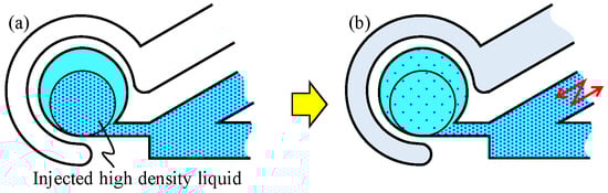 Experiment 1 (Conventional Method): At first, all channels except for the driving channel are filled with pure water. Subsequently, the colored water or water containing microbeads is injected into the main channel. By manually controlling the flow speed, we injected the high-density liquid into the circular chamber in a VVG manner [