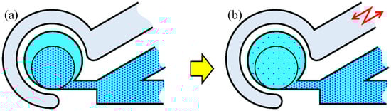 Figure 2 shows the principle of the deformation of the elastic wall depending upon the vibration phase of the real actuator. When negative pressure is applied to the driving channel, the liquid existing in the neck channel flows into the circular chamber along the wall because of its inertia, as shown in