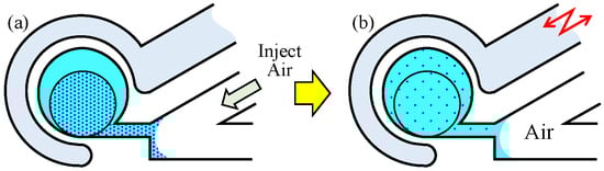 Experiment 3 (Proposed method with the air-based valve): At first, when taken in experiment 2, the colored water or liquid containing microbeads is injected into the circular chamber. Subsequently, a syringe with air is connected to the main channel to inject air into the main channel, as shown in
