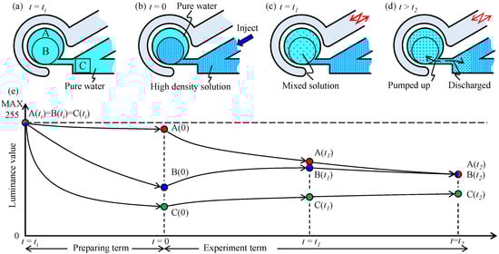 6], especially with different densities in a microchannel to observe the different reactions of the cells for nourishments or poisons of different densities. There are two methods for fabricating different-density areas in a microchannel. One is to create a gradient of solute in a large chamber by diffusion, and the other is to make several chambers with different densities. As for the former, Frevert et al. injected a small amount of high-density solution from a small nozzle into a large chamber, and the injected solution diffuses naturally to create a density gradient inside the chamber [