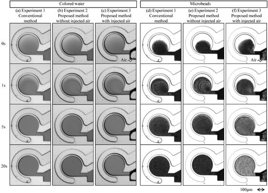 Experiment 2 (Proposed Method): At first, all channels are filled with pure water. Then, the colored water or the liquid containing microbeads is injected into the circular chamber in a manner similar to that used for the preparation in experiment 1, as shown in