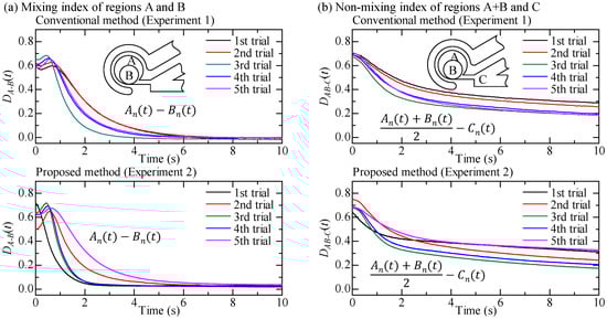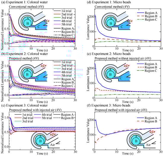 Figure 11a shows that the luminance value becomes the same for all experiments in less than 10 s in both the conventional and proposed methods. As a general tendency, completing the mixing action is faster in the proposed method than in the conventional method.