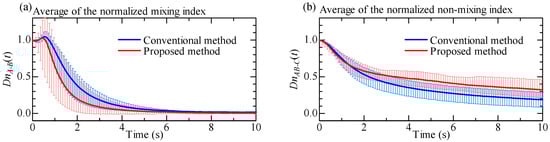 Figure 12, we can clearly observe that the normalized mixing index decreases more sharply under the proposed method than under the conventional method. As for the non-mixing index, the behaviors for both methods are similar up to 1.5 s, but there is a noticeable gap in the behaviors at