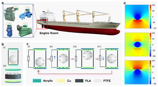 Composition and working principle of the bouncing-ball triboelectric nanogenerator (BB-TENG) sensor. (a) Schematic diagram of BB-TENG sensor applied to ship equipment vibration monitoring; (b) structure of the BB-TENG sensor; (c) working principle of the BB-TENG sensor; and (d) the electric potential distribution on the BB-TENG sensor by COMSOL Multiphysics® (Version 5.5, COMSOL Inc., Stockholm, Sweden).