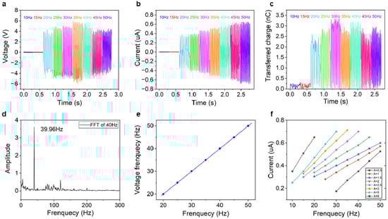 Additionally, it can be discovered from Figure 3f that the change of Isc always shows a good linear relationship with the change of the vibration frequency in every specific amplitude, which reveals the other way to understand the vibration frequency or working condition of the ship machinery. In theory, according to the working principle of TENG [45] and the characteristics of PTFE ball, when the PTFE ball is charged by friction with copper electrode, the charge density on the surface of PTFE ball is constant for long time. The charge transfer between the two electrodes in external circuit occurs when the ball separates from one electrode until it comes into contact with the other. Because the charge transfer in each contact separation is consistent theoretically, and the relationship between short-circuit current and transferred charge is shown in the following equation: