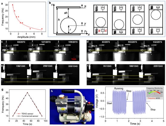 Working range and working characteristics of the BB-TENG sensor. (a) The minimum stable frequency at different amplitude. (b) Equivalent dynamic model of the PTFE ball bouncing in the container cylinder. PTFE ball-bouncing status at (c) frequency of 25 Hz, (d) frequency of 30 Hz and amplitude of 0.5 mm with a ball diameter of 5 mm and container cylinder height of 6 mm. PTFE ball-bouncing status at (e) frequency of 10 Hz, (f) frequency of 15 Hz, and amplitude of 3 mm with a ball diameter of 5 mm and container cylinder height of 8 mm. (g) Comparison between the BB-TENG sensor and a commercial vibration sensor. (h) The BB-TENG sensor is arranged on the air compressor and (i) used to monitoring the vibration condition of the air compressor.