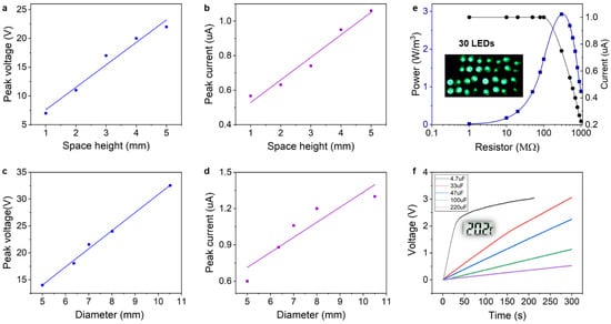 Except for performance of sensing, the BB-TENG sensor also shows the potential to be self-powered by means of collecting the vibration energy of the ship machinery and converting it to the electric energy. In order to explore the self-powered potential of the BB-TENG, the power generation performance of it is shown in Figure 5. Figure 5a,b depict the relationships among the maximum Voc and Isc of the BB-TENG with the same bouncing ball (db = 7 mm) and different container cylinder height. With the increase of the container cylinder height, the maximum Voc at different container cylinder height increases as well. The maximum Voc and Isc reach about 22 V and 1.06 μA, respectively, when the container cylinder height is 5 mm. Additionally, the maximum Voc, and Isc of the BB-TENG with different PTFE ball diameter has been shown in Figure 5c,d. Obviously, the maximum Voc and Isc of the BB-TENG increases along with the increase of the PTFE ball diameter until they rise to 32.5 V and 1.3 μA, respectively. Therefore, when the BB-TENG is applied to be the energy harvester on condition that the vibration energy and installation space is enough, we should choose these two parameters as large as possible.