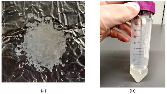 (a) The 98% hydrolyzed PVA crystal. (b) In-lab prepared PVA solution.