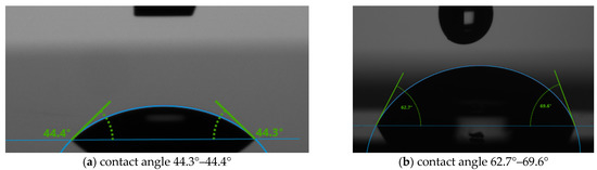 Figure 3 shows the contact angle of 2.5% PVA on Silicon, and the angle is found to be 44.3°–44.4° without O2 plasma-treated surface and 62.7°–69.6° for the plasma-treated one. From these two analyses, it is observed that the O2 plasma improves the contact angle of the substrate significantly.