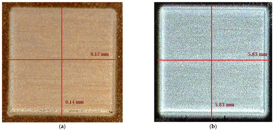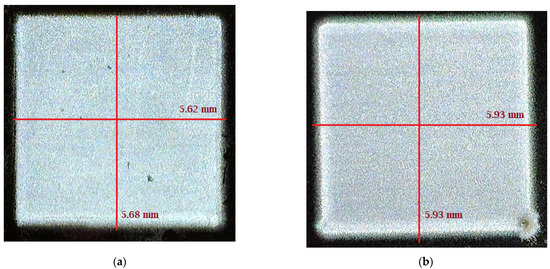 A test pattern size of 5 mm by 5 mm was designed using AutoCAD 2019 (Autodesk, San Rafael, CA 94903, USA). The file was saved as .dxf format. Then, using manufacturer provided plug-in, VMTools, the .dxf file was converted to .prg file. The .prg file is the only file format that is supported by the AJ 300 deposition system. A multi-layer structure is printed on a Silicon substrate. Figure 5 shows the two layers and four layers of PVA printed patterns on the substrate. Although, the target length and width are 5 mm by 5 mm, however, after printing the pattern size is 5.62 mm by 5.68 mm, and 5.93 mm by 5.93 mm for two and four PVA layers, respectively. It is to be noted that, by appropriate pattern modification, it is possible to achieve the target pattern size. The maximum size of pattern that can be printed by an AJ 300 is 300 mm by 300 mm with the highest in-situ platen temperature of 120 °C. For large sized or multi-layer pattern printing, the ink spreading will increase along with time.