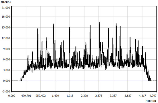 Thickness Profile of Printed PVA: KLA Tencor D-300 (Milpitas, CA 95035, USA) profiler was used to measure the thickness and roughness profile of the printed patterns. Figure 7 shows the thickness and roughness profile of four printed layers of 2.5% PVA on the Silicon substrate.