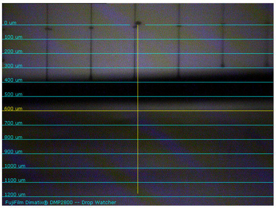 Inkjet Printing of PVA: The Fujifilm Dimatix DMP-2800 (Santa Clara, CA 95050, USA) deposition system allows fluidic materials on 8 by 11-inch substrate with a maximum substrate height of 25 mm. The deposition head utilizes a disposable piezo inkjet cartridge. The platen of the system is vacuum controlled with an adjustable temperature up to 60 °C. The ink-dispensing mechanism by piezo inkjet cartridge head is activated by four different voltage phases, which can be adjusted up to 40 V to achieve good jetting. The voltage phases break down a solution into droplets to start printing/jetting process. It is very difficult to handle long chain polymers with inkjet printing because the highest voltage of DMP-2800 cannot break the long polymer chains to make it into droplets form. However, PVA is a short chain polymer, hence it is possible to break it’s polymer chain with the voltage. Although, due to the amalgamation tendency, the nozzles tend to get clogged very frequently. PVA test print is carried out for two different types of pattern: For smaller area coverage and for larger area coverage, (i) 5000 µm × 150 µm line and (ii) 5000 µm × 5000 µm square, respectively.