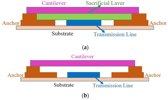 The schematic of a typical double clamped micro-electro-mechanical-system (MEMS) device structure. (a) MEMS device structure before the removal of sacrificial layer; (b) MEMS device structure after the removal of sacrificial layer.