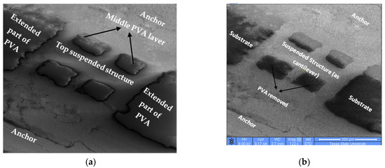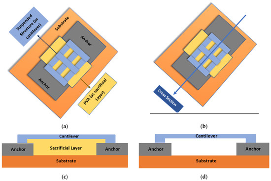 Figure 11a shows the top view and the schematic that is used to make a suspended structure. The cross-section region is illustrated in Figure 11b, while Figure 11c,d show the elaborated cross-section view of the structure before and after the removal of sacrificial layer. It is important to highlight that this structure is not a complete MEMS structure; here the printed PVA is portrayed as a sacrificial material which can be used in MEMS device fabrication in future work.