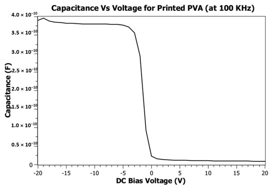 The dielectric constant of printed PVA has been calculated from capacitance vs. DC bias voltage measurement. Figure 13 shows the capacitance vs. DC bias voltage at 100 kHz. The DC bias voltage is applied from −20 V to 20 V, and the highest capacitance measured is 4 × 10−10 F. From that measurement, the dielectric constant of printed PVA is calculated to be 168.