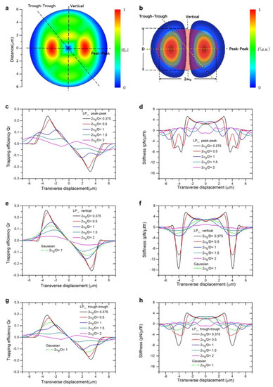 For different ratios of beam to particle size, we plot trapping efficiencies and stiffness as a function of displacement from beam center along two directions, peak-to-peak, vertical and trough-to-trough, as indicated in Figure 1b, Figure 2b and Figure 3b using axial symmetry of beam profile overlaid with the particle. Compared with a Gaussian beam of the same size, the maxima of trapping force is close to those of modes LP11 (2ω0/D = 1, green dotted line in Figure 1e,f), yet the force curve exhibits ripples along the peak-to-peak direction, owing to restoring forces acting on the particle by two inline traps consecutively when the particle is displaced, as shown in Figure 1c,d. The maximum trapping force increases with decreasing ratio of beam size to particle size, as expected for high intensity beams. Along the vertical direction, peak trapping force is slightly higher than that along the peak-to-peak direction (Figure 1c verses Figure 1e), attributable to simultaneous action of two traps formed by LP11 mode field. But an interesting feature about these inline two traps is that trapping force in the vertical direction beyond maxima falls off much faster than that in the peak-to-peak direction, for the reason that action of trap force ceases soon after overlap reduces between particle and two traps, see Figure 1e for 2ω0/D = 1, 0.5, and 0.375. It is also noted that the calculated stiffness swings fast from positive to deeper negative peaks, shown in Figure 1f as oppose to Figure 1d. Close to the origin, trap stiffness continuously deviates from its value at the origin instead of holding constant, similar to the distribution of a focused Gaussian mode [23]. In the peak-to-peak direction, stiffness curves dictate characteristics of trapping forces exerted by two separate traps simultaneously by LP11 mode. When 2ω0/D increases and exceeds 1, the width of trapping force becomes wider and peak value decreases significantly, which makes the capture and transport of particles not secured. Figure 1g,h shows trapping efficiency and stiffness as a function of displacement along the trough-to-trough direction, where maxima trapping force is about 40% lower than those along the vertical direction.