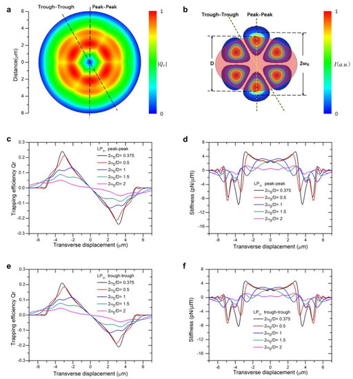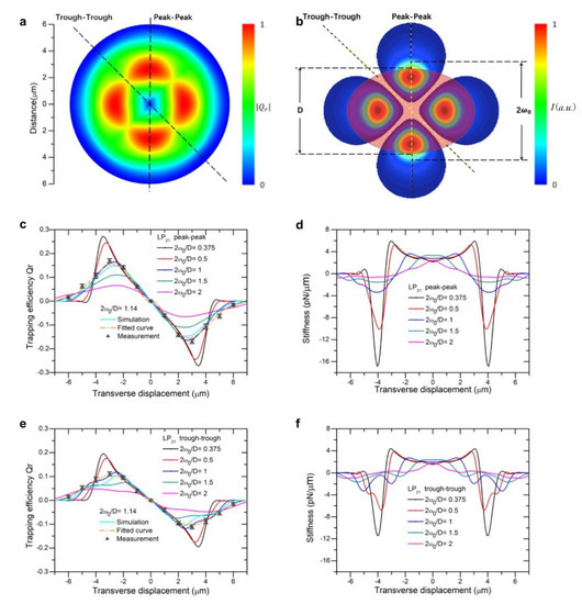 The LP31 mode exhibited higher axial symmetry of trapping efficiency and stiffness as compared with the previous two modes (Figure 3a). Although Qr decreases to a certain extent in the gaps between adjacent strong electric field distributions, the gap was much smaller than the particle size, and thereby little change in trapping forces or stiffness curves were observed. Therefore, the trapping force profiles along the two directions are fairly close, apart from that the peak value in the trough-trough direction was lower than that in peak-to-peak direction (Figure 3c vs. Figure 3e). Similar patterns were observed for trapping stiffnesses, as shown in Figure 3d,f.