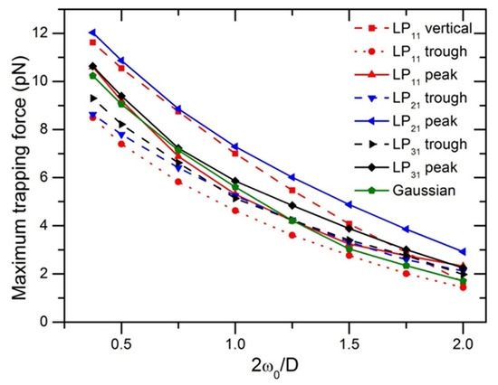 Figure 4 displays the maximum trapping force in different directions as a function of ratio of beam to particle size at the illumination power of P = 10 mW. The maximum magnitudes of Fmax from the highest to the lowest, were obtained with LP21, LP11, LP31, and LP01 Gaussian modes, respectively. For LP11 mode, displacing the particle along 45 directions with respect to the peak-to-peak direction, trapping force dropped about 36%, as can also be observed in the 2D force map in Figure 1a. Trapping efficiency produced by LP11 along the trough-to-trough direction is similar to that generated by LP21 along the peak-to-peak direction, but the difference from each other increases with increasing 2ω0/D, due to the two-lobed field distribution of LP11. The four-lobed field of LP21 mode surrounds a spheroid-shaped particle with a relative high stability. It is noted that Fmax of a Gaussian beam as compared with that of other high-order modes, is in the middle of Fmax values of other modes in different directions, as a result of axial symmetry.