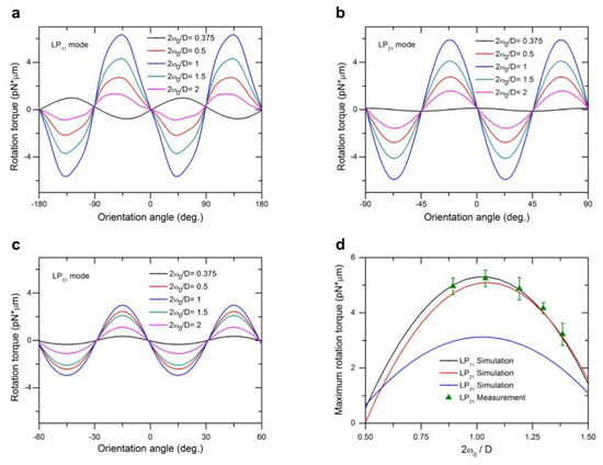 Therefore, it can be seen from Figure 5a–c that the maximum optical torques (or holding torque) occur between two adjacent symmetrical overlap configurations between the light field and spheroid particle. In Figure 5d we examine the maximum optical torque as a function of beam to particle size ratio. We also observe that the LP11 mode provides the maximum peak value of optical torque, while that of LP21 is slightly lower, and the LP31 mode is smaller still, retaining only 57% of the torque produced by the LP11 mode under the same beam power. It is clear that the holding torque decreases with an increase in the axial symmetry of the light field, approaching zero for a Gaussian beam theoretically.