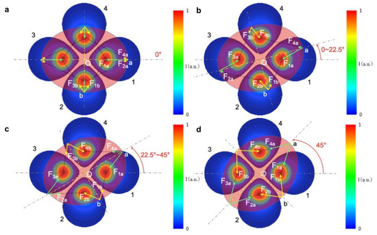 Diagrams for rotation torque analysis exemplified with an LP21 beam. (a) Rotation torque is zero due to balanced forces at the orientation angle of 0°, with respect to the symmetric axis of the mode field distribution; (b) A decrease in clockwise rotation torque due to reduced overlap of mode field with spheroid particle for orientation angle of 0–22.5° with respect to the symmetric axis of the mode field distribution, as indicated by sequential increase in uncovered area of beam lobe #1; (c) A net clockwise rotation torque generated by unbalanced force pairs at orientation angle of 22.5°–45° with respect to symmetric axis of mode field distribution; (d) Rotation torque returns to zero at 45°.
