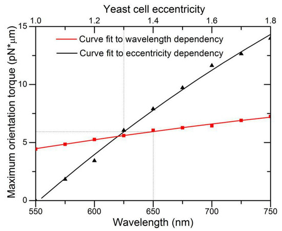 We also investigated the dependence of holding torque on wavelength and cell eccentricity. Under the illumination condition where LP21 mode laser power P = 10 mW and beam size 2ω0 = 4.8 μm, we varied the short axis length and fixed the long axis length at 5.8 μm for the spheroid particle, and then computed maximum rotation torque as a function of the eccentricity. Figure 8 demonstrates a nearly linear increase in maximum rotation torque with eccentricity. As the short axis reduces in length, the interaction of the high-mode light field approaches the physics limit analogous to two light spots capturing a microrod at two ends, while the additional two light spots have little counteracting effect. This is also similar to the high effectiveness of rotation produced by a LP11 mode beam. For wavelength dependence, optical torque is theoretically linearly proportional to wavelength owing to the factor of P/ω to convert torque efficiency τz to torque Mz. However, the calculated result deviates slightly from linear dependence for the reason that the model T-matrix is approximated by a finite Nmax terms of series expansion, thus, computation of all coefficients of anm, bnm, pnm, and qnm in Equation (6) are related to the size of wavelength-related domains.