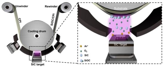 Schematics of the reactive sputtering process to deposit silicon oxycarbide (SiOC) films on colorless polyimide (CPI) substrates using a lab-scale roll-to-roll (R2R) sputtering system at room temperature (RT).