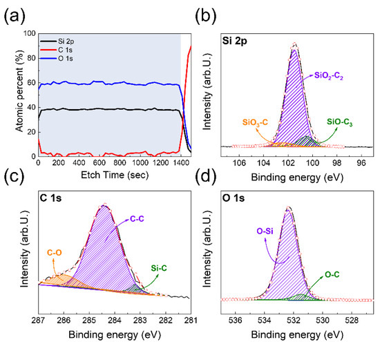 To investigate the binding state and composition of the R2R-sputtered SiOC HC film on the CPI substrate, an XPS depth profile and survey analysis was conducted. Figure 2a represents the atomic composition of the SiOC/CPI as a function of etch time from surface to substrate. The blue shadow region in the XPS depth profile indicates the SiOC layer on the CPI substrate. In the SiOC layer, the atomic percentages of each atom, such as Si, C, and O, were maintained uniformly with the increasing etching time. The uniform atomic composition of SiOC HC implies that, during the reactive sputtering of the SiC target, the oxygen atoms are incorporated well into the SiOC films. However, because of the organic contamination on the surface of the SiOC film, the atomic percentage of C atom is relatively higher at the surface region of SiOC than at the SiOC film region. Due to the residual C-based gas products, such as CO2 and CO, that are formed during the reactive sputtering process using a SiC target, it was found that the number of C atoms in SiOC films is much lower than that of Si atoms. Figure 2b–d show the XPS spectra at the core level of Si 2p, C 1s, and O 1s obtained from the SiOC film, respectively. The XPS spectra were calibrated with the center of the C 1s peak at 284.5 eV. Figure 2b shows that the XPS spectra of Si 2p are deconvoluted into three Gaussian peaks, which are located at 100.5, 101.6, and 102.6 eV [21] and which indicate the SiO–C3, SiO2–C2, and SiO3–C bonding states, respectively.
