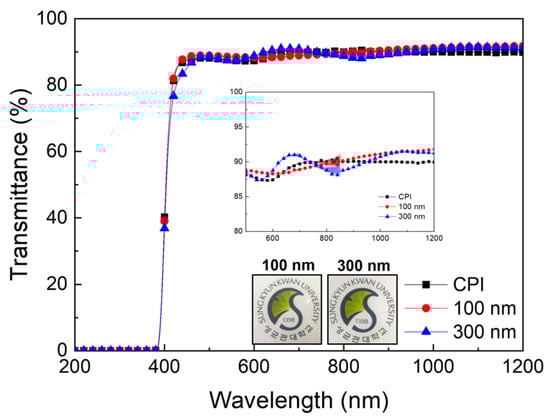 Optical transmittance of the bare CPI substrate and 100 and 300 nm-thick SiOC-coated CPI films. Insets show the enlarged spectra and pictures of the university logo through the transparent SiOC/CPI samples.