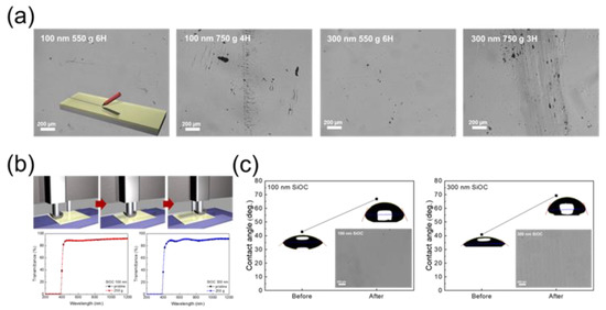One of the crucial properties for the flexible cover window is a high scratch resistance. We analyzed the scratch resistance via a pencil hardness tester and steel wool scratching tester. During the pencil hardness test, pencil leads with a standard hardness grade of 3 to 6 H were moved across the surface of SiOC films under the pressure of 550 and 750 g loads. Then, steel wool of #0000 grade was moved on the SiOC samples under weights of 250 g for 500 cycles. Figure 5a shows the surface optical microscopy (OM) images of SiOC films after the scratching of pencil under a special weight, while the inset shows the method of the pencil hardness test. Figure 5a shows that under the weight of 550 g, the SiOC HC layers with thickness of both 100 and 300 nm resist the pencil grade of 6H. However, under the weight of 750 g, the 300 nm-thick SiOC films are scratched at a pencil grade from 3H, while in the case of the 100 nm-thick SiOC film surface scratches begin from a higher pencil grade of 4H. The anti-scratching properties of SiOC films in steel wool test were evaluated using transmittance, contact angle, and OM images. Figure 5b shows the change in transmittance after the steel wool scratching test. After the steel wool test, the transmittance of the SiOC films with thicknesses of 100 and 300 nm was barely changed. However, Figure 5c shows that after the steel wool test, the contact angle of H2O droplet with SiOC films increased. In the case of the 100 nm-thick SiOC HC layers, the H2O contact angle increased from 44.2 to 66.77°; in the case of SiOC films with a thickness of 300 nm, changed from 40.76 to 69.29°. Herein, the contact angle increased because of the increase in surface roughness induced by the steel wool test [33,34]. This can be explained by the Cassie–Baxter theory, according to which, air molecules that are trapped in the furrows in a rough surface generate a composite (solid/air interface) hydrophobic surface, resulting in a large contact angle in comparison to a flat surface [35,36,37].