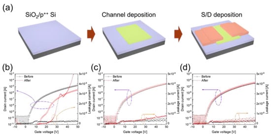 Furthermore, the impact protection properties of SiOC/CPI films were examined with TFT devices. Figure 7a shows the fabrication procedure of the InZnSnO (IZTO)-based TFT devices. The TFT devices were fabricated on thermally oxidized 200 nm-thick SiO2-coated p++ Si substrates. The SiO2 and p++ Si were used as a gate insulator and global gate electrode, respectively. A 30 nm-thick indium zinc tin oxide (IZTO) channel layer was deposited by the RF sputtering of IZTO target, and a 100 nm-thick ITO S/D electrode layer was deposited using the DC sputtering of the ITO target. Both the channel and S/D patterns were defined via invar metal shadow masks. Figure 7b–d represent the drain current (Id)–gate voltage (Vg) characteristics of the TFT devices at a constant drain voltage (Vd) of 10 V. The Id–Vg curves before the impact pushing test show traditional n-type switching properties (turn on at positive Vg, and turn off at negative Vg). The gate leakage currents of the as-fabricated TFT devices are below 10 nA in the Vg of −10 to 50 V. When impact is applied to the TFTs without the cover window of the SiOC/CPI film, the Id–Vg curves move to the positive direction of Vg, and the on-state current at a Vg of 50 V significantly deteriorates by about ten-fold. Additionally, when a high Vg is applied to the TFTs the gate leakage current drastically increases. In contrast, when TFTs are covered with SiOC/CPI films, as shown in Figure 7c,d, the Id–Vg curves are almost the same, even after the impact pushing test. Though the TFTs maintained their original Id–Vg characteristics, the gate leakage current was slightly increased. The results of the impact pushing tests of the TFHs and TFTs confirm that the R2R-sputtered SiOC films on the CPI substrate effectively protect the flexible devices from damage from external impacts.