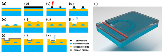 (a–k) Process flow of fabricating a lithium niobate (LN) microring resonator coupling with a silicon nitride (Si3N4) waveguide in the vertical configuration. (l) Three-dimensional (3D) diagram of the coupling structure.