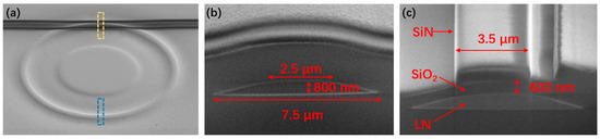 Figure 2a shows the top-view scanning electron micrograph (SEM) of the vertically coupled LN microring and Si3N4 waveguide. The profiles of the microring buried beneath SiO2 layer can be distinguished in the SEM image. The radius of the LN microring is 50 μm. The cross section of the LN microring, as indicated by the blue dashed area in Figure 2a, is shown in Figure 2b. In the current design, the LN microring has a trapezoidal cross-section with a top width of 2.5 μm, a bottom width of 7.5 μm, and a height of 800 nm, which is covered by a 1.5-μm-thick SiO2 cladding layer. The cross section of the coupling area (yellow dashed area in Figure 2a) is shown in Figure 2c. The three-layer structure, i.e., LN, SiO2 and Si3N4 from bottom to top, can be clearly seen. The thickness of the PECVD SiO2 layer was reduced from 1.5 μm to 600 nm by FIB etching for evanescent light coupling. The rib Si3N4 waveguide was fabricated by FIB etching with a width of 3.5 µm and a rib height of 550 nm.