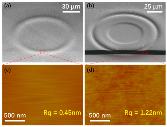 Furthermore, we measured the surface roughness for both the LN microring resonator fabricated by CMP and the trench in SiO2 layer (i.e., the bottom of the trench) generated by FIB etching that are critical in obtaining high Q factors. Figure 3a,b present the SEM images of fabricated LN microring after CMP (step e in Figure 1) and the etched trench of the SiO2 layer using FIB etching (step h in Figure 1). Using an atomic force microscope (AFM), we measured the surface root-mean-square roughness (Rq) in the areas that are indicated by the red squares in Figure 3a,b respectively. An ultralow surface roughness of Rq ~ 0.45 nm can be achieved by the CMP processing, while a slightly higher roughness of Rq ~ 1.22 nm was achieved after FIB etching. Based on the smooth surface morphology, we can expect a high-Q LN microring resonator.