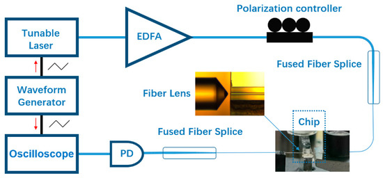 We used an experimental setup to examine the coupling effect of the configuration and characterize the optical mode structure of the LN ring resonator, as schematically shown in Figure 4. A tunable laser (TLB 6728, New Focus Inc., San Jose, CA, USA) was employed to couple light into and out of Si3N4 waveguide through the lensed fiber with a taper angle of 90°. In order to enhance the detection signal, the tunable laser was boosted by an erbium-ytterbium-doped fiber amplifier (EYDFA, Golight, Inc., Culbertson, NE, USA) before coupling into the Si3N4 waveguide. The linewidth of the tunable laser is 200 kHz. The polarization of the pump laser was adjusted by an in-line fiber polarization controller. A photodetector measured the transmission of resonant mode (New focus 1811-FC-AC, Newport Inc., Irvine, CA, USA). We used an arbitrary waveform generator (AFG3052C, Tektronix Inc., Beaverton, DC, USA) to synchronize the tunable laser and oscilloscope signals.