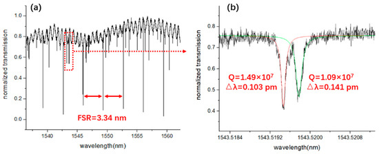 Figure 5a shows the transmission spectrum for the wavelength range from 1537 nm to 1562 nm. The free spectral range (FSR) of the microresonator was measured to be 3.34 nm. A pair of the splitting whispering-gallery modes at the resonant wavelength around 1543.52 nm was chosen for the measurement of the Q-factor by fitting with a Lorentz function. The Q factors were measured to be 1.49 × 107 and 1.09 × 107, respectively, as indicated by the Lorentz curves shown in Figure 5b. The Q factors vary from 2.9 × 106 to 1.49 × 107, which is mainly caused by the different coupling condition of the whispering gallery modes. The high Q-factor of the LN microresonator indicates that the fabricated device with the vertical integration configuration functions effectively for evanescent light coupling between the LN microring and the Si3N4 waveguide.