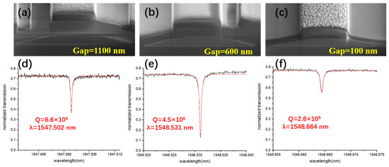 Finally, we demonstrated that, in our scheme, the coupling efficiency as well as Q-factor can be tuned by changing the thickness of the SiO2 cladding layer, i.e., the vertical distance between the Si3N4 waveguide and the LN microring. The distance was adjusted by precisely controlling the FIB etching depth of the PECVD SiO2 layer. When the thickness of the SiO2 cladding layer was set to 1100 nm, the coupling efficiency was relatively low, leading to the undercoupling between the Si3N4 waveguide and the LN microring and giving rise to a high Q-factor of 6.6 × 106, as illustrated in Figure 6a,d. Subsequently, we adjusted the distance to 600 nm, as shown in Figure 6b. The transmission loss of the light in the microring was close to the coupling loss between the waveguide and microring, which indicated that the critical coupling condition was reached. The deepest dip can be observed in the transmission curve presented in Figure 6e, and the Q-factor was 4.5 × 106. In general, the Q factor should be higher for the critical coupling condition than that obtained in the undercoupling condition. Here, the slightly lower Q-factor measured in the critical coupling condition can be attributed to various imperfections in the fabrication process, which could influence the intrinsic Q of the microring itself beneath the coupling Si3N4 waveguide. When the distance was further reduced to 100 nm, a higher coupling efficiency was reached at the strong over-coupling, whilst the Q factor decreased to 2.6 × 106, as illustrated in Figure 6c,f. The Q factor that we mentioned here is loaded Q factor.