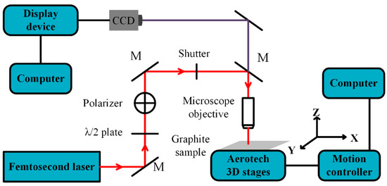In our experiment, graphite foil was divided into square flakes (25 mm × 25 mm × 0.1 mm in dimension) for easier processing. Prior to laser treatment, the upper surface of the graphite foil was cleaned with ethanol.
