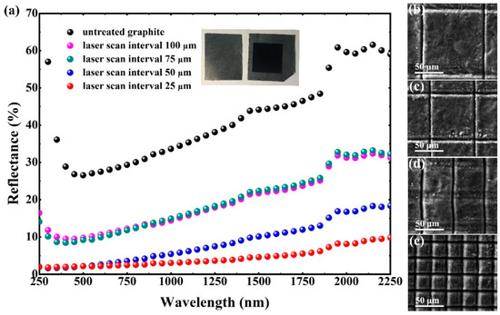 (a) Comparison of the graphite surface reflectance values corresponding to different intervals; scanning electron microscope (SEM) images of the laser-induced structures characterizing different scanning intervals of (b) 100 μm, (c) 75 μm, (d) 50 μm, and (e) 25 μm, respectively.
