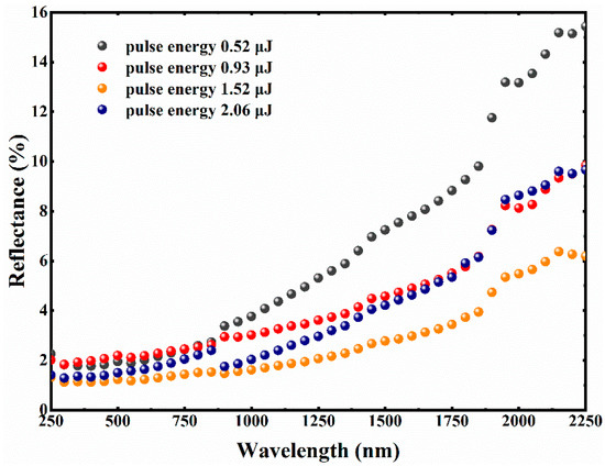 The reflectance spectra of the graphite surfaces with femtosecond laser pulse energies ranging from 0.52 μJ to 2.06 μJ (with a fixed scanning interval of 25 μm) are shown in Figure 3. A slight increase in reflectance is observed at a non-optimal laser pulse energy. A significant decrease in reflectance and increase in absorptance over the broadband spectrum are observed after optimizing the parameters of femtosecond laser pulse energy. As the laser pulse energy gradually reaches 1.52 μJ, the average reflectance of graphite surface decreases to 2.7% in the ultraviolet, visible and near infrared regions (250 to 2250 nm). Compared with the optimization result of the laser scanning interval as previously mentioned, it is apparent that the reflectance of the graphite surface after laser energy re-optimization is obviously suppressed over the whole of the measurement wavelength. The spectral curve of the lowest reflectance is provided in orange, with below 1.2% reflectivity in the ultraviolet and visible spectral region and below 3% reflectivity on average in the ultraviolet, visible, and near infrared regions (250 to 2250 nm).