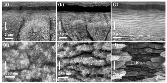 SEM images of surface structures. Here, the laser pulse energy for sample (a–c) is 0.93 μJ, 1.52 μJ and 2.06 μJ, respectively; (d–f) are high-magnification SEM image corresponding to (a–c). Double headed solid arrow represents incident laser polarization.