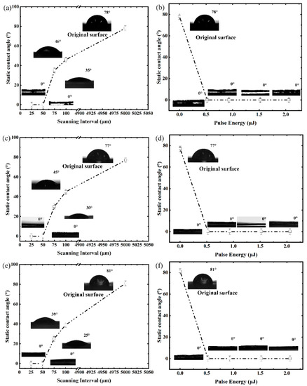 Dependence of the static contact angles on scanning interval at (a) 25 °C (c) 80 °C (e) 3 °C and dependence of the static contact angles on pulse energy at (b) 25 °C (d) 80 °C (f) 3 °C.